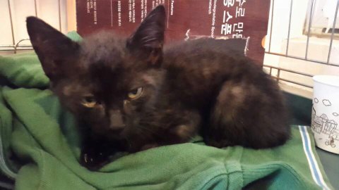 여아, 3개월 추정, 검은색이랑 고등어태비 섞인 무늬이고 사람 잘 따르는것 같습니다!
