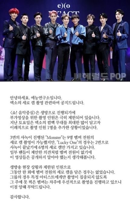 이어 “3번의 사녹(사전녹화)이 진행된 ‘몬스터(Monster)’는 9명 멤버 전원의 세로 캠 촬영이 가능했지만, ‘럭키 원(Lucky One)’의 경우는 2번으로 사녹이 끝났기에 6명의 세로 캠만 가지고 있다”며 “생방송 현장 상황과 제한된 인원으로 그동안 한 회에 멤버 전원의 세로 캠을 담은 경우는 없었다. 그룹의 경우 특정 아티스트에게만 촬영이 집중되지 않도록 그 주에 못 찍은 멤버는 차주에 우선적으로 촬영을 진행하고 있으니 이점 양해 부탁드린다”고 설명했다.