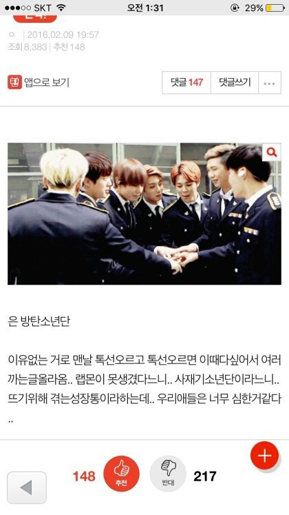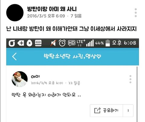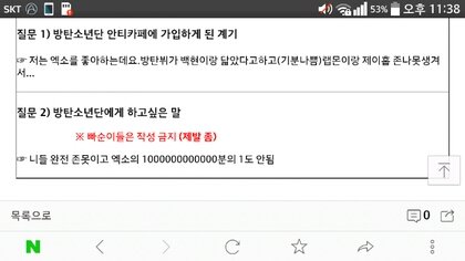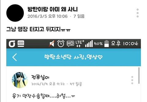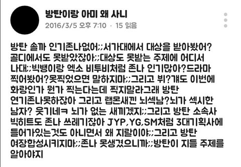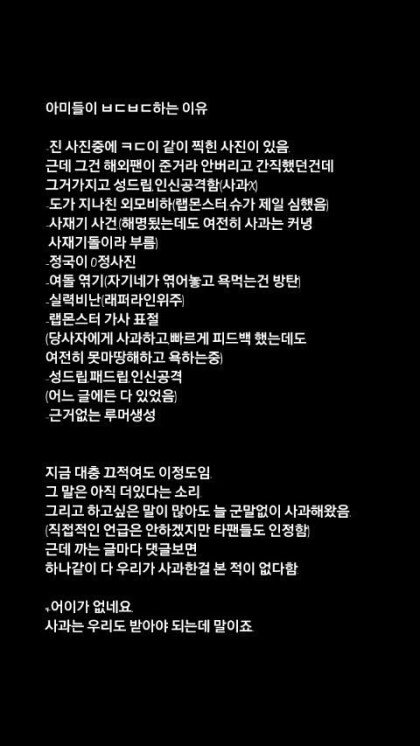 는 방탄소년단 패드립 성드립은 기본에 ㅅㅍ드립 사재기 드립 등 도를 넘는 발언들을 들었음 그런데도 정작 그런 말들 한 당사자들은 코빼기도 안 보임 조카 안쓰럽다 팬들도 가수도 마음고생 엄청 심할듯...