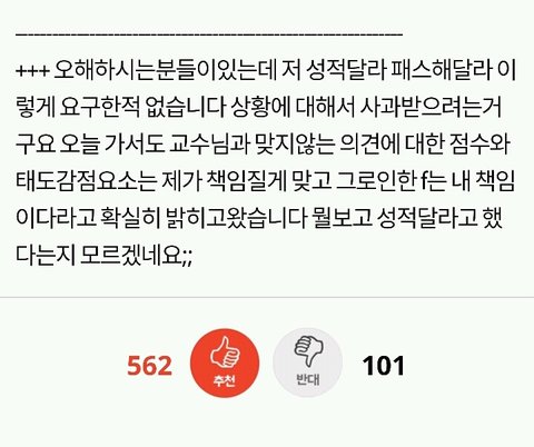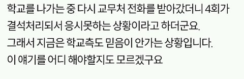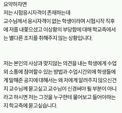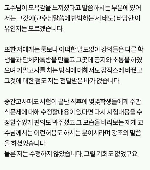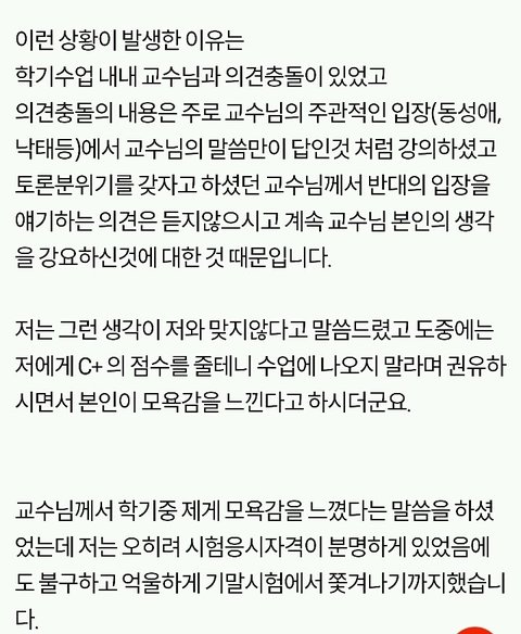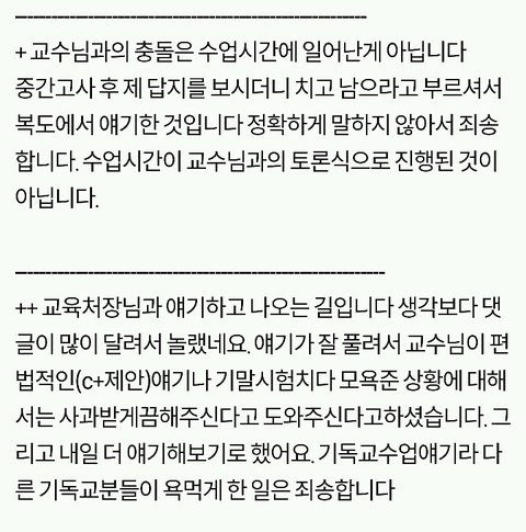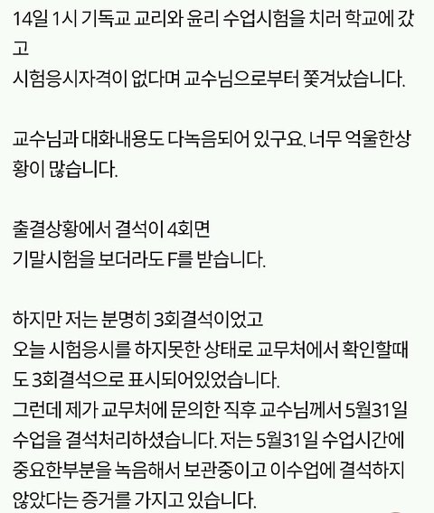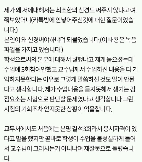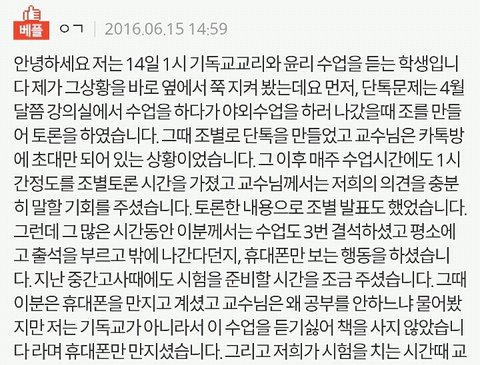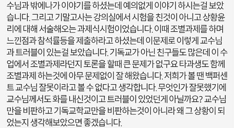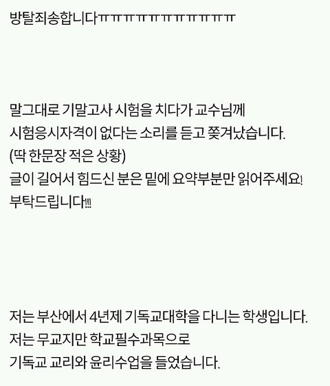 쫓겨났다는 쓰니글에 대해서, 같은 수업 들은 분이 따로 올린 글입니당 http://pann.nate.com/talk/332001944?page=1 시험 도중 쫒겨났다는 분과 같은 수업을 들은 사람입니다. 꼭 봐주셨으면 좋겠어요. ㅋㅇ (판) 2016.06.15 21:29 조회89 모바일로 쓰는거라 맞춤법 이해 좀 부탁드릴께요ㅎㅎ 거두절미하고 제목 그대로 같은 수업을 들었던 사람입니다. 그 때 상황을 말해보자면, 시험 응시하는 학생은 6명밖에 없었습니다. 저희과 5명, 타과생 1명. 교수님께서 시험종이를 나눠주시며 시험을 치라고 했고 저희는 바로 써내려나갔습니다(오픈북이었어요) 근데 그 분께서 교수님께 뭘 써야되냐고 물었고 교수님께서는 그걸 왜 모르냐고 하셨습니다. 당연한게 중간고사에도 나왔었고, 교수님께서 몇 주 전부터 기말 시험은 상황 윤리에 대해 서술하는 것 이라며 공지를 해주셨습니다. 수업시간에도 그랬고 단톡방에도 올려주셨어요. 교수님과 그 학우분이 얘기를 하는데 제 친구가 그냥 상황윤리에 대해 서술하기만 하면 되냐고 물었고 그 학우분은 그 말을 듣고 그제서야 써내려갔습니다. 그러다가 교수님께서 수업명을 적으라하셨고 그 분께서는 수업명이 뭐냐고 교수님께 되물었어요. 교수님께서는 어떻게 수업명도 모를 수가 있냐고 물어봤고 그 학우분은 기독교인이 아닌데다가 4학년이라서 정확하게 모르겠다라는 식으로 계속 얘기 했어요. 거기서 교수님과 조금 말다툼을 하다, 왜 자기는 단톡방에 없냐, 조 만들 때 수업을 안 들어서 조가 없어 혼자 있으면 교수가 챙겨줘야 되는 것 아니냐 등등의 발언을 했습니다. 교수님께서는 매우 화가 나셨고 내가 왜 챙겨줘야되냐, 학생이 자주 빠지지 않았냐 수업시간에도 매우 불성실했다 등등의 얘기를 하며 결석이 4회 이상이면 시험 칠 자격이 없으니 나가라고 하셨어요. 그러더니 그 학우분은 시험지를 찢으면서 나가셨구요. 여기까지가 그 때 상황이고 빠진 것도 몇 개 있을거에요. 하지만 절대 주관적인 것은 넣지 않았어요. 지금부터 사족을 덧붙일거에요. 이 교수님께선 작년 1년동안 저의 채플 수업 담당 교수님이셨구요 그 수업을 듣는 학생들은 다 비기독교인이었어요 절대 저희에게 교회를 강요한 적 없으셨어요 그냥 기독교 학교 다니면서 교회를 한번쯤은 가보는게 좋지 않겠냐고 넌지시 물은 정도? 그리고 과목이 교양과목이다 보니 크게 중요하지 않은게 있어서 학생들의 편의를 많이 봐주셨어요. 중간고사 때 수업 전 15분 정도? 공부할 수 있는 시간을 주셨는데, 그 때 교수님께서 공부 안해도 되겠냐고 물어봤는데 그 학우분께서 자긴 기독교인이 아니라서 책을 안 샀다며 휴대폰만 보고 있었어요. 매 수업시간마다 휴대폰만 하고, 조별로 모여서 토론을 할 때에도 아무데도 끼지 못하고 계속 폰만 봤었어요. 저희 과 분위기가 대체로 누굴 배척하지 않아요. 그래서 아무 애들한테나 상황 말하고 같이 해도 되겠냐 물으면 그러자고 하는? 그런 분위기에요. 그래서 타과생 분도 쉽게 조를 만들어서 조별활동도 다 끝냈구요. 그 분이 무조건 잘못했고, 교수님께서 무조건 잘했다는건 아닙니다. 사심 때문에 없는 말을 지어낸 건 없어요. 제가 봐왔던 그대로를 쓴 것 입니다. 너무 한 쪽면만 보고 휩쓸리지 말라고 글을 쓴거에요. 마무리를 어떻게 해야될지 모르겠네요.. 그럼 다들 편안한 밤 되세요ㅎㅎ