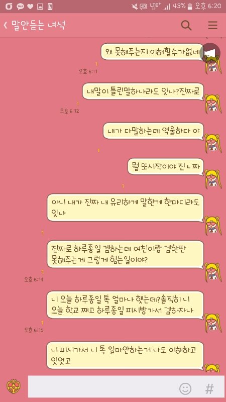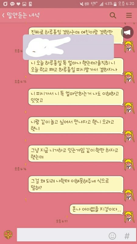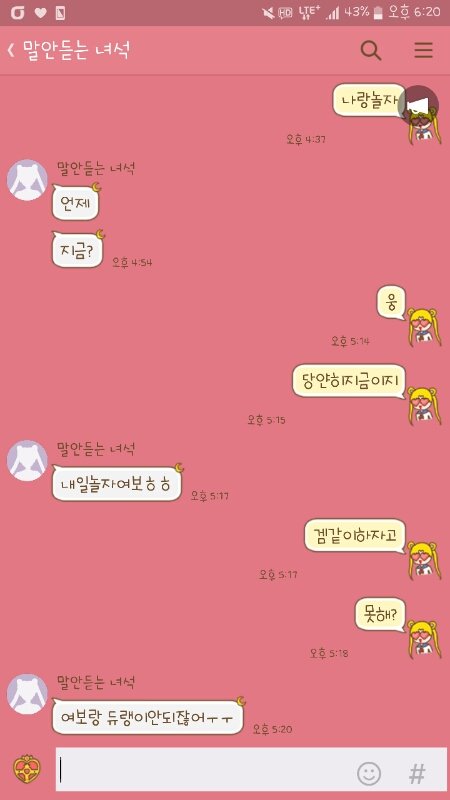 -남자친구 나랑놀자 -언제 지금? 웅 당연히 지금이지 -내일놀자여보ㅎㅎ 겜같이하자고 못해? -여보랑 듀랭이 안되잖어ㅜㅜ(렙이 안되서 같이못함) 랭안하면되잔 -친구두명이라좀... 그래 -낼보잖어... 알겟으니까 겜해그거나랑 하루에 한판해주는거도 못해? -이럴까봐 낼보자한거야 겜같이 안해준다고 삐질게 뻔하니까 그게어려운거야?그냥여친이랑 겜한판하는거돈드나?니 친구랑몇판하는데그중 한판을 나랑하는게 그마이 힘드나진짜 궁금하네 -아진짜 또 시작이네 ㅋ 아니 진짜 못해줄일이면 이해 하겠는데왜 못해주는지 이해할수가없네내말이 틀린말 하나라도 잇나?진짜로내가 다말하는데 억울하다 야뭘 또 시작이야 진짜아니 내가 진짜 내 유리하게 말한게 한마디라도 잇나진짜로 하루종일겜하는데 여친이랑 겜한판 해주는게 그렇게 힘든일이야?니 오늘 하루종일 톡 얼마나햇는데?솔직히 니 학교쨰고 하루종일피방가서 겜했잔어니 피시가서 니 톡 얼마 안하는거 나도 이해하고 있었고 니랑 같이 놀고싶어서 만나자고 햇니 오라고햇니?그냥 지금 니가 하고있는게임 같이 한판하자고 했는데그걸 왜 되려 나한테 이해 못해주네 식으로 말해?조카 어이없을 지경이다..