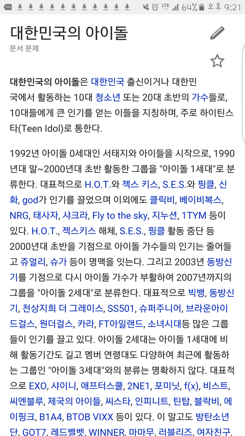 1세대:(90년대 후반~2000년대 초반)HOT.젝키.신화.GOD.핑클.SES등등,