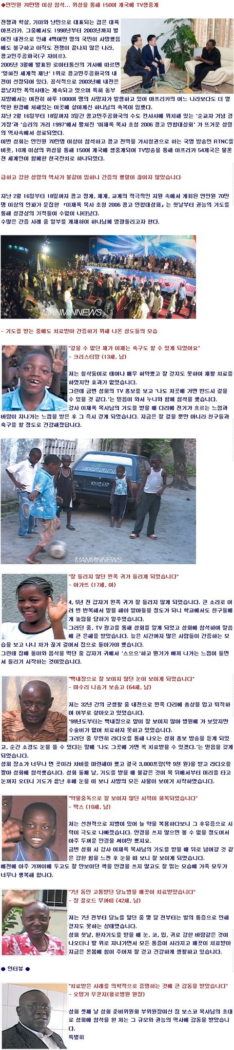 언론의 적극적인 성원에 열린 이번 성회는 연인원 70만명 이상이 참석했으며, 콩고 전역을 가시청권으로 하는 국영방송인 RTNC를 비롯, 10개 이상의 위성을 통해 150여 개국에 생중계되었다. TV방송을 통해 아프리카 54개국은 물론 전 세계인이 함께한 천국잔치가 되었다고 평가되고 있는 '2006 이재록 목사 초청 콩고 연합대성회'의 현장을 이모저모 살펴본다.