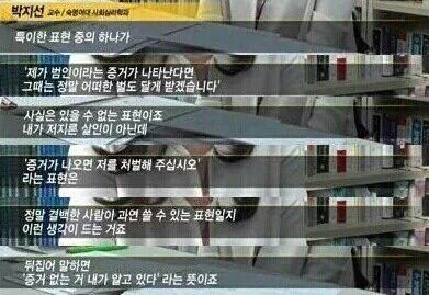 밑에 인터뷰는 어떤 시사프로그램에서 진짜 살인 저지른 사람이(사이코패스였나?) 말하는 패턴 분석한 건데 그만큼 완벽하게 증거인멸을 했기 때문에 전 범인이 아닙니다 가 아니라 '증거가 나타난다면'이라는 조건을 다는거라고 함. 화장실을 좋아하는게 아니라 증거 안남기기 위해 화장실 이용한게 맞다는거네...