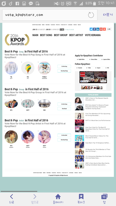 로그인 필요없고 3개 부문 다 투표해줘! 세번째는 베스트 케이팝 아티스트인데 정꾸가 1위니까 정국이한테 몰표주는걸로~ 얼마 차이안나니까 투표좀해줘 링크 http://kpopstarz.com