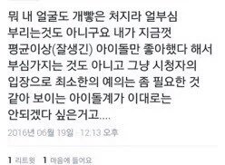 나는 참고로 캐럿이고 스밍인증 1기인증 얼마든지 할수있으니 제발 저거 해명좀..잡수타고 암말도 안하고있어 진짜..준면이 욕은 안먹게해줘..내새끼 욕먹는게 얼마나 기분안좋은 일인지는 알아 제발 서로의 아이돌은 욕 안먹도록하자..우리 우지 욕먹는거 마음아픈데 다른 퍈들은 어떻겠냐고...저 펜페만 욕한거아냐 시우민 팬도 초성으로 타돌 욕해놓고 잠수탄거야..비공우로 틧돌려놓고..진짜 미치겠다