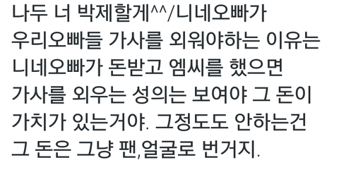 가사 안 외웠다고 돈을 그냥 팬이랑 얼굴로 번 거라냌ㅋㅋㅋㅋㅋㅋ와 ㅅㅂ...이건 너무하잖앜ㅋㅋㅋㅋㅋㅋㅋㅋㅋㅋ가수가 얼굴로 돈 벌고 사는 직업이냨ㅋㅋㅋㅋㅋ다른 건 다 참아도 저건 걍 태태가 지금까지 한 노력들 다 짓밟는 말이라 너무 빡친다;;;
