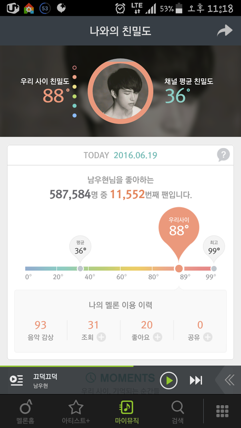 7일만에 멜론 친밀도 84% 올랐다 인증은 담에 해주라면 해줄게 지금도 스케치북 돌려보고있고 얼마전에 안녕하세요에도 출연했을때 남우현이다!!!하고 외칠정도로(원래 내 가수밖에 모르는데 어찌 아냐 했는데 결국...^^이해부탁해) 인피니트의 멤버인지만 알고 그랬는데 결국엔 이렇게 됐네~ 우현군 짤좀 부탁해~~ 많이 두고두고 보고파졌어ㅠㅠ