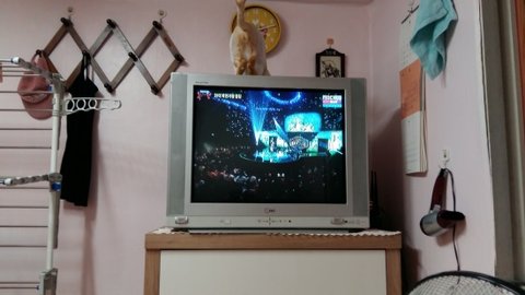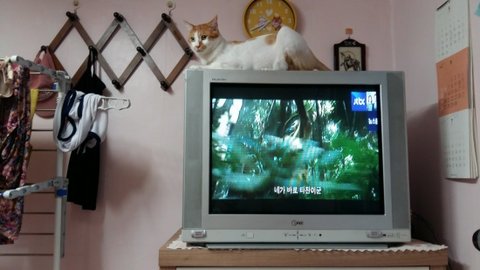 도칠이가 좋아하는 자리에 저렴한 중고티비를 사서 놓았음.