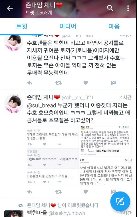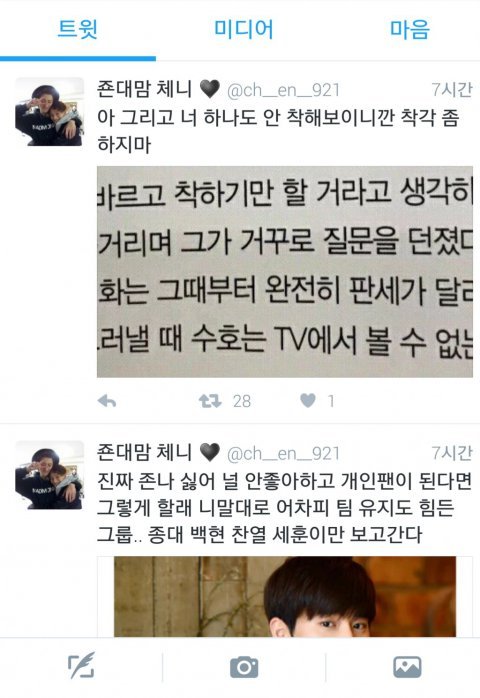 죤대맘체니가 진심으로 발악한게 백현 호시닮았다는말들었을때랑 어제 술빵이 아빠별명 저격했을때임 저래도 종대만 욕먹으니까 종대방패로 맘편하게 백현팬질도하고 악개짓도하는 백현팬같음