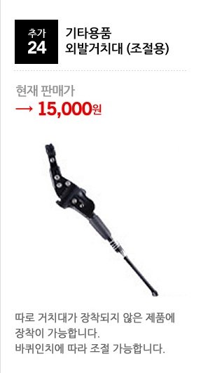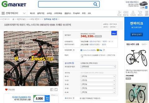 자~ 보시니 어떠한가! 뒷바퀴는 펑크가 나 있고, 안장은 구멍에 맞게 들어가지도 않는 쓰레기 재고로 보냈고, 안장 가방은 앞에 장착하는게(\20,000원) 아니라 뒤에다 다는게(\12,500) 왔고, 외발 거치대(\15,000)는 그림처럼 까맣고 스프링이 있는 것이 아니라 은색의 스프링 없는 걸로 왔는데, 아버지 말씀으론 그게 더 싸구려가 분명하다고 그러시네(아마 자전거포에서 아무 자전거에 달아주는 것으로 보이는 \10,000원 이하의 제품). 그러다가 옥션에서 구매했다는 걸 염두에 두고, 혹시나 해서 G마켓을 살펴보았더니 다음과 같은 화면이 보인다.