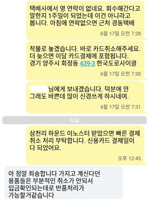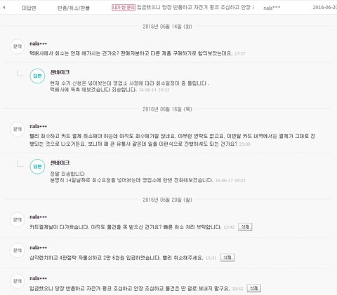 헌데 회수한다는 말은 최초로 6월 10일 금요일에 나왔고, 그 때는 반품보류 상태였고 13일 월요일에 맞교환하기로 합의를 봤고 뭐 당장이라도 회수할 것처럼 하더니만, 화요일이 지나고 목요일이 지나도 감감 무소식이다. 이게 어찌된 일인가?