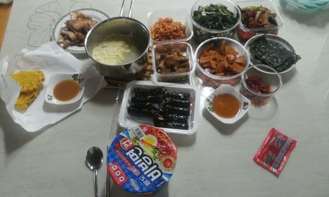 고구마튀김 + 비빔면 + 삼겹살 + 마약김밥 + 계란찜 + 기본반찬 ㅎㅎ 만족!