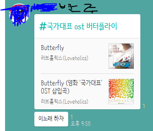 솔직히 나만 나는 나비 별로야? 물론 좋은 노래긴 한데 그런 노래에 맑은 악기 들어가면 어쩌라고 그런 노래를 하는지.. 그래서 그렇게 후보 정해진걸로 알고 월요이ㄹ에 정하자-!하고 집에 왔는데 카톡이 이런 내용이 와있었어