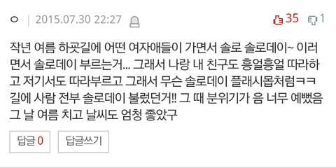 심심해서 명예의 전당 보고 있었는데 저 글 본문이 아마도 살면서 잊지 못할거 같은 순간 말해보자 그런거 같은데 저 댓글에 솔로데이가 언급됐기도 하고 뭔가 기분 좋아지는 댓글이라 캡쳐했는데 뭔가 내가 저 순간에 있을거라 생각하니 되게 포근하고 편안하고 청량하다... 머릿속 상상에서 이미 아날로그 파리 필터를 낀 느낌이랄까... 그만큼 청량하고 무슨 분위기인지 알거같다