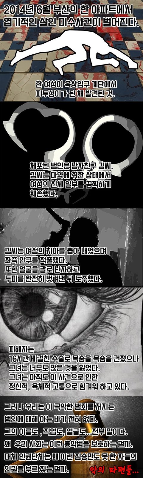저 피해여성은 불륜을 저지른 내연녀였음... 직업은 술집마담 피해자, 가해자 모두 부인이 알고있음에도 밀애를 즐겼고 .. 나중에는 대놓고 만남을 즐김.. 사건이 있었던 날 .. 가해자가 피해자에게 필로폰을 투여함(남자가 약물중독) 피해자 내연녀는 약에취해 그날을 기억못한다고 함 그나마 치아뽑고 안구적출하고 두피 벗겨낸 그 끔찍한 고통을 기억못하는게 다행이라고 생각함 저 남자 꼴랑 30년 징역 받았고 저 싸이코패스가 30년뒤면 우리와 함께 이땅에서 다시 살아가게됨.. 너무 끔찍함 네이버 검색하면 자세한 판결문까지 다 나옴~~
