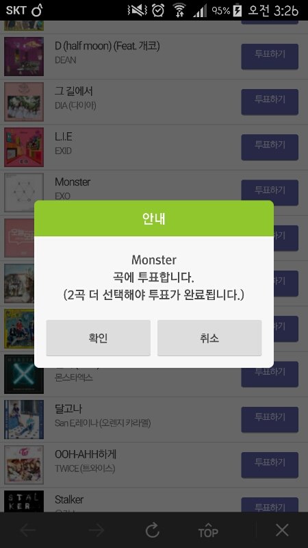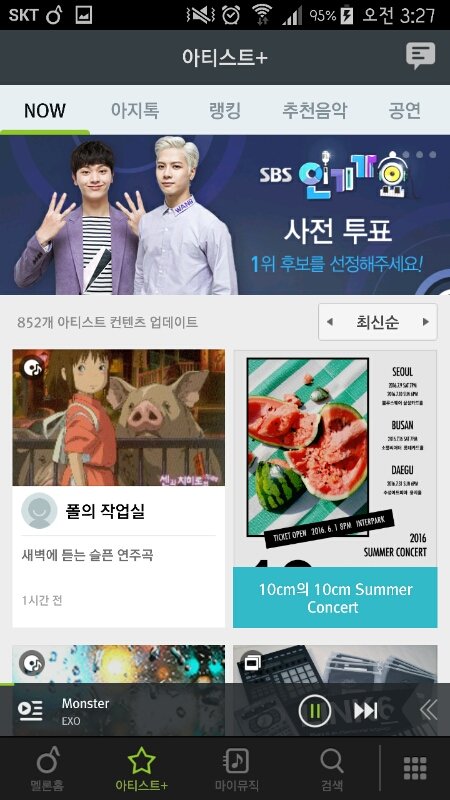 두번째에 있는 아티스트+ 들어가서 맨위 광고(?)넘기다보면 애들 노래 나오니까 투표하자~ 3곡 투표해야 투표완료되니까 애들노래로 투표하구~!! 강요는 아니야 어차피 투표도 그렇고 콩도 마찬가지고 앨범사는거도 그렇구.. 할사람만 하지만!! 혹시 모르잖아? 또 1위하면 미공개된 영상들 민석이가 올려줄지ㅠㅠㅠㅠ