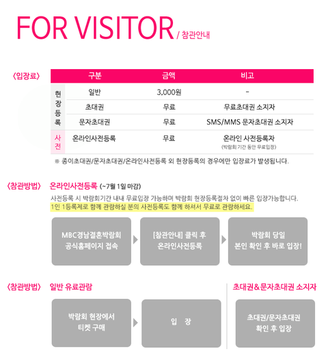 *이번 제15회를 맞이한 세코웨딩박람회의 관람안내에 대해 살펴볼께요!지금 공식홈페이지를 통한 온라인사전등록을 이용해주시면 박람회기간 내내 입장료무료이며 사전등록자분들을 위한 EVENT에도 자동응모되니 참고해주세요! * 온라인사전등록 마감일 : 7월 1일(금)