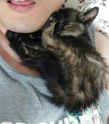 이것저것 처치를 했는데 문제는 스스로 먹지 않는다는 거였어요. 너무 어려서 스스로 먹을줄 모르는 거였는지...기운이 없어서였는지는 모르겠지만 병원에서 그것까지 해줄 여럭은 안되는 것 같아 임보하실 수 있는 분을 수소문하여 보냈습니다. 임보처에서 첫날... 그렇게 기운없던 녀석이..애교는 어찌나 많은지... 혼자자려하지 않고 초면에 넉살좋게도 임보자 어깨에서 잤다고 하네요.