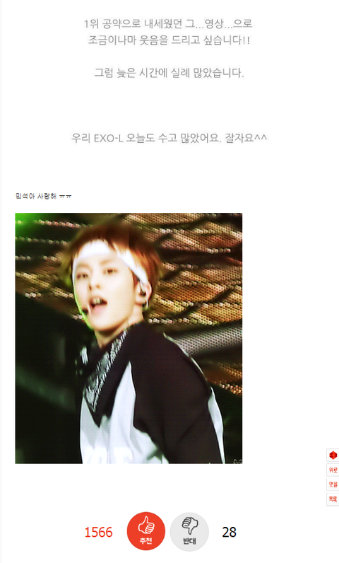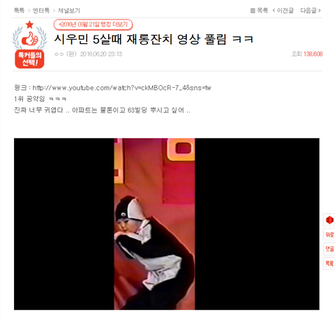 웅녀들 며칠전에 민석이 1위 공약 약속 지키느라고 올려준 재롱잔치 영상 톡선에 올라갔던거 생각나지? 안본 사람은 있어도 한번만 본 사람은 없다는... ㅋㅋ 갑자기 아가슈가 생각나서 가봤는데 조회수도 대박 추천수도 저렇게나 대박이었네 ^>.<^ 보니까 엑소엘사들은 말할 것도 없고 타팬분들도 귀엽다 역시 아이돌은 떡잎부터 다르다 그런 댓글들 엄청 많더라구 ㅋㅋㅋㅋㅋ