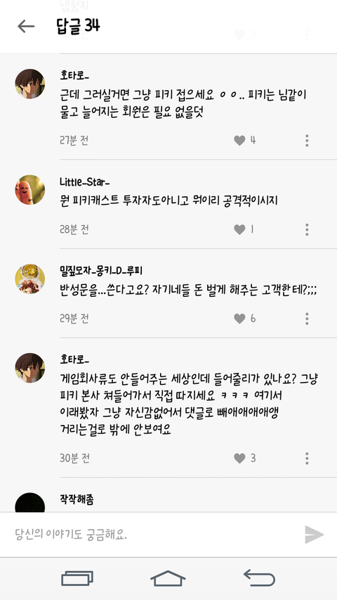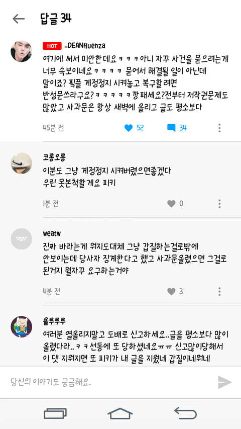피키 사과문은 잘 읽었습니다. 그런데 그 논란이 많던 사건의 사과문은 상단바에 올라와 있지도 않았습니다. 심지어 그 사과문의 댓글이 절반넘게 모두 상단바에 올려질 것을 요구 하였지만 피키는 그저 네이트판 링크가 있는 댓글을 삭제 하는 등 회피하고 있습니다. 그 사과문의 댓글도 무시하자 몇몇 사람들은 다른 게시물로 들어가 항의를 하였습니다. 그런데 반응이 충격적이었습니다. 사람들 적고 여자남자가 골고루 있고 신선한 게시글이 올라올 때부터 있었던 사람으로써 정말 실망하여 이만 피키를 삭제하려고 합니다.