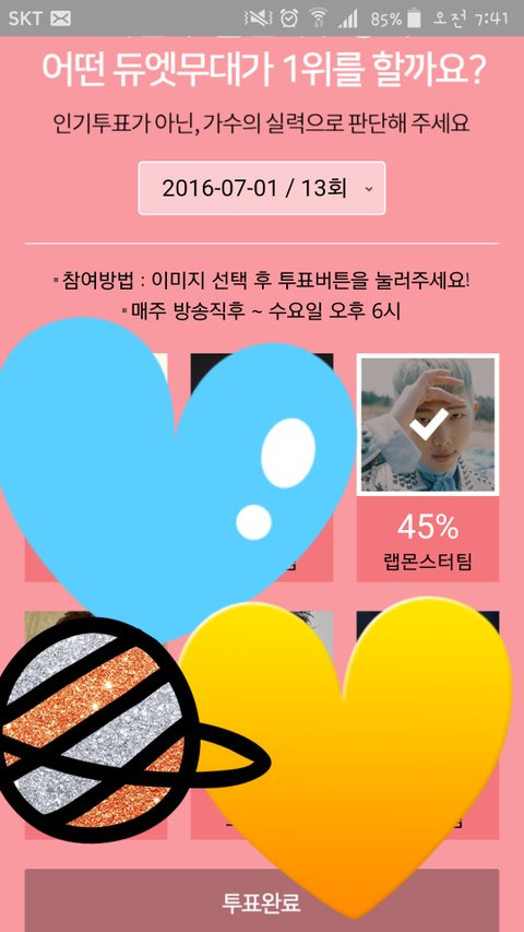 뒷북인지는 모르겠는데 선호도투표 하더라구 지금 남준이가 1퍼차이로 2위야 얼굴책 계정으로 로그인 가능하니깐 투표하장..!... 다음주 수요일까지래