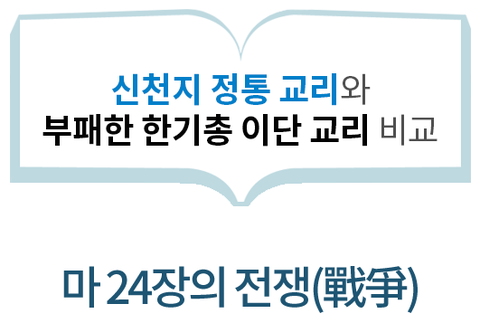 : 증거하는 말(교리)로 싸우는 영적 전쟁이다. - 마 24장은 신약의 예언으로, 예수께서는 나라와 나라, 민족과 민족 간의 전쟁을 주 재림 때 재난의 시작이라고 하셨다(7, 8절). 마 24장의 전쟁이 ‘세계 곳곳에서 빈번하게 발생하는 육적인 전쟁’이라면, 이 말씀이 기록된 이후 2천 년 동안 지구촌은 그러한 전쟁의 연속이었는데, 과연 언제가 마 24장에서 말한 전쟁이 일어나는 때였다는 말인가! 본 장의 나라와 민족은 육적인(세상의) 나라와 민족이 아니라, 하나님의 나라 장막과 마귀의 나라 영적 바벨론을 두고 하신 말씀이다. 그리고 이들의 싸우는 무기는 서로를 증거하는 말(교리)이다(계 12:7, 11, 엡 6:10~17, 고후 10:3~5).