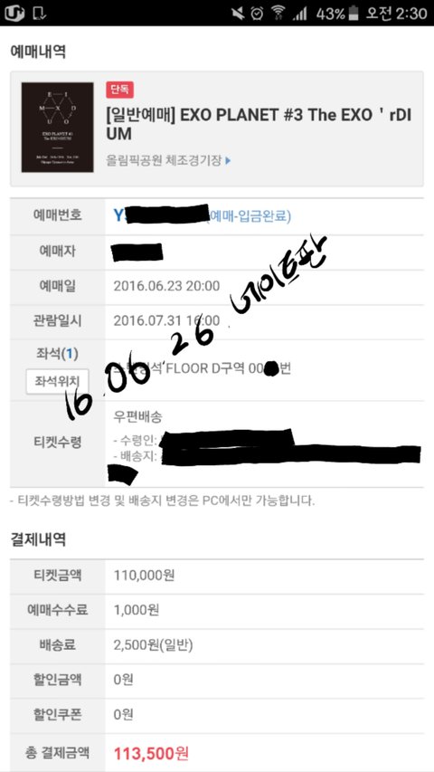 예매번호, 좌석, 수령인, 주소만 지움 입금은 완료했고