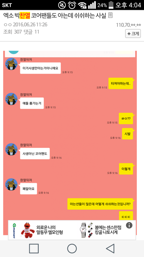 ㄴㅇㄱ에 캡쳐하러 갔더니 이수법 똑같이 지금 찬열이로 루머 퍼뜨리고 있고 루머가 너무 저질인데 요즘 박유천 일로 룸 얘기 많이 나오잖아 인스타그램에도 룸계정 생겨서 비리 풀고 근데 남연갤에서 이번엔 찬열이로 완전 조직적으로 움직일려나봐.