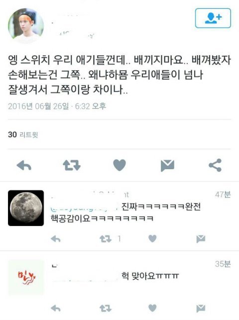 저 발언 한 팬은 비아냥거리면서 사과하고 지금 트친이랑 놀고 있음;;