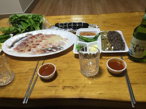 파전은 빠삭하게 굽기가 힘들어서 부추랑 방아잎 땡초 잔뜩 넣고 전 부쳐서 한잔 했습니다. 저는 막걸리를 술 중에 제일 사랑하는데 막걸리 먹으면 애미애비도 못알아보기땜에 간혹 가다가 등산이나 노가다 같은 빡센일 하면 핑계삼아 마시곤 해요~ 저날은 주말을 마무리 하고 새벽에 일터로 가야했기에 저걸로 그만은 개뿔 새벽까지 달리고 새벽 기차에서 아저씨 냄새 풀풀 풍기며 출근했답니다
