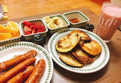밥 하기싫은날엔 이렇게 다태운 핫케익과, 소세지굽고, 과일놔두고 저녁.