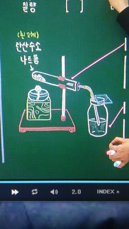 그중에 이상화 탄소 분해되잖아? 저기있는 노란 고무빨때를 타고 이산화탄소가 석회수한테 내려와서 투명했던석회수가 하얗게 흐려지는대