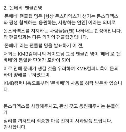 몬스타엑스멤버들과 팬덤분들 충분히 인지시키겠다고 소속사 담당자분이 이야기하셨는데 여태까지 몬애기, 몬아가,몬벱 몬베비 이렇게쓰시는분들계시구요.