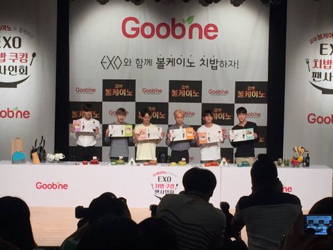보이그룹 엑소(EXO)가 29일 청담동 일지아트홀에서 열린 '굽네 볼케이노와 함께하는 엑소(EXO)치밥 쿠킹 팬사인회'에 참석해 포토타임을 갖고있다.