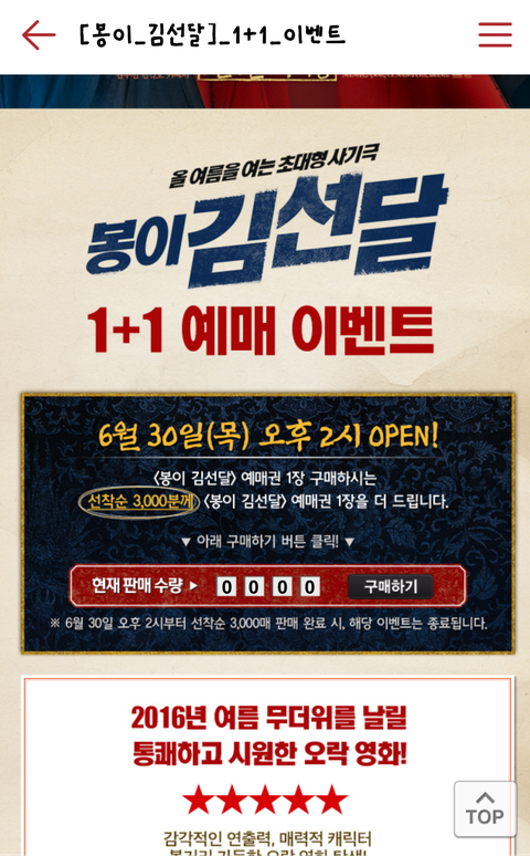 2시부터 선착순3000명한테 김선달 1+1예매권 쿠폰준대!