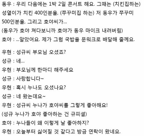 누나들은 왜 이렇게 나를 좋아하지?이거ㅋㅋㅋㅋㅋ이호원이 말하자마자 팬들 소리완전 지르던뎈ㅋ 나는 누가 녹음한거 올린거로 들었는데 말투 ㅈㄴ능글능글 하고 먼가 설렜음 나는 누나도아닌데ㅋㅋㅋ