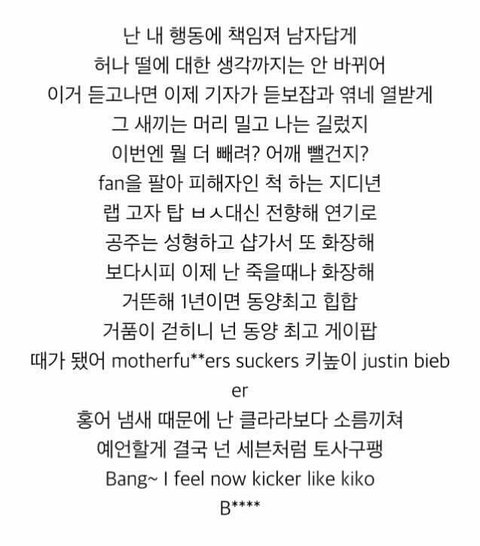 이게 클라라,빅뱅 지디,빅뱅 탑,세븐 디스한 가사내용이야 홍언뭐고 빅뱅 팬언급하고 뭐하는짓이지