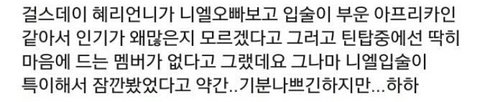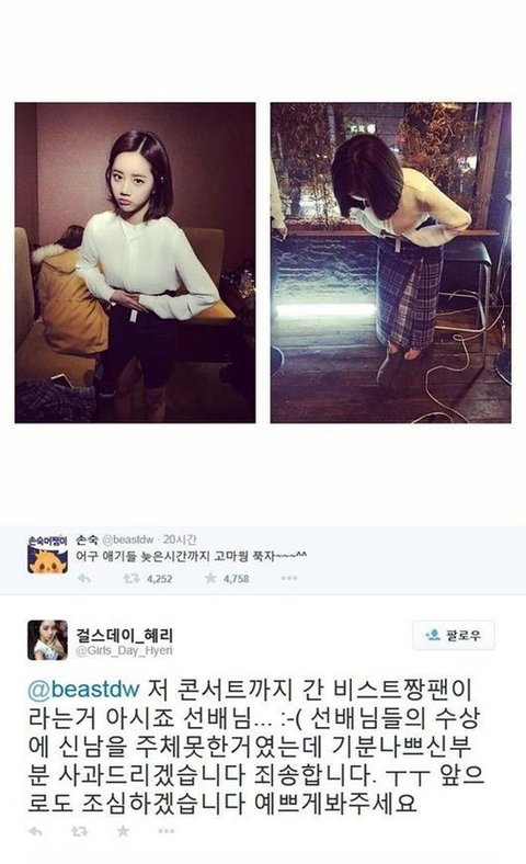 비스트 때는 진짜 생각이 있는 앤지 없는 앤지 모르겠었음 직멘으로 귀엽게 찍은 사진 보내면서 선배님 짱팬인 거 아시죠...:-( 이러는 게 사과니 애교니? 예쁘게 봐 주세요는 또 왜 붙어?