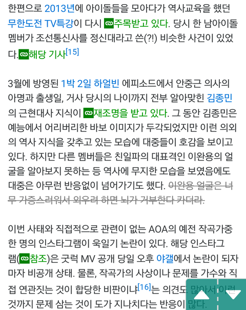 파도타기하다가 ㅇㅏㅇㅗㅇㅏ 문서까지 들어갔는데 역사왜곡 논란에 여담이라고 이거 적혀있더라.. 이얘기가 왜 타돌문서에 들어가있어야되는지 게다가 사실도 아닌데 그런데다가 엄청나게 논란인것처럼 적어놓은것도 어이없고 저기 링크된 기사도 ㄱㅇㅎ 기자가 쓴거더라고;; 기분도 그렇고 아무생각없이 보는 사람들이 오해할까봐 수정했는데 내가 괜한짓 한걸까.. ㅠㅠ 돌려놓을까..