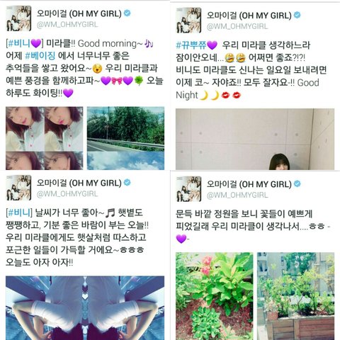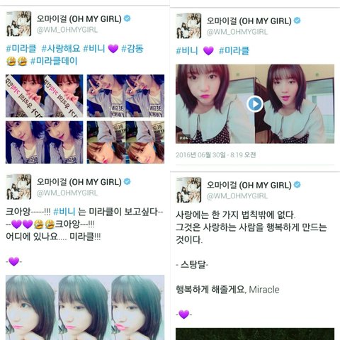 비니가 원래 소통왕이라고 팬들 사이에서 그렇게 불림 오마이걸 멤버들 한명 한명 다 미라클 많이 언급해주고 트위터에 글도 올려주는데 특히 비니는 장문으로 많이 글을 올려줘서 오마이걸의 소통왕임 진짜 말도 너무 예쁘게 해주고 하루에 몇개씩 글을 올리기도 함...! (비니 글마다 보라색 하트가 있는 이유는 비니가 보라색 덕후...)