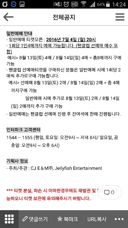 별빛파워 보여주자♡ 투표하면 일반예매티켓팅 성공!!ㅋㅋ 나도오늘예매야ㅜ...하떨린다 아래는 공카일반예매공지!! 다들 열투하고 티켓팅 겟또하자♡