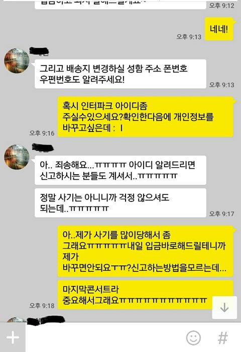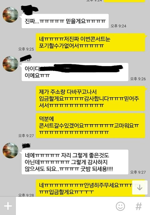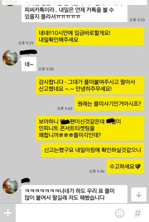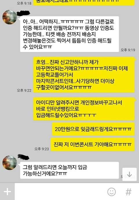 15년도라 말투가 좀 이상해도 넘어가줘../// 일단 나는 콘못가서 플미충이라도잡자!식으로 제일유명한 중고카페?거기들어가봤더니 역시나 플미충들이 많더라고 그중에 하나 잡아서 먼저 카톡했더니 그 뒤로는 일이 술술ㄹ...ㅋㅋㅋ 일단 초반에 조금 찌질해보이게 ㅠㅠㅠ이러면서 말투도 좀 어리게?랄까나 그런식으로 말하고 이사람이 정말 표를 예매한게맞는건지 알아야해서 인증해달라고해! 근데 중간중간 다른사람이랑도 거래중이라면서 다른사람이 15를 불렀다면서 그런사람들이 드문드문있을거야 그 상대방도 플미충잡으려고하는건진 몰라도 일부러 가격 좀 더 높여서 파려는사람도있단말이야 무조건 그 장단에 북치고장구치고 다 맞춰줘. 그다음에 진짜 애잔애절하게 ㅠ를 붙여가면서 이번콘가야한다고 마지막콘서트라고 사기당하면안된다고 오늘안에 더 넣어서 입금해줄테니까 배송지만 내가 바꾸게 해달라고 진짜 빌어야함. 근데 선량한플미충은 ok할수도있지만 그게 또 의심가는 플미충은 계속 곤란하단식으로 피해갈거임 그때 진짜 더 애절돋게 부탁한다고 제발 이번콘서트 제발 진짜 가야한다고 자꾸 불쌍한어필을 해야함ㅠㅠㅠ 근데 안넘어가는애들은 안넘어감 ㅇㅇ 그러면 바로 이때까지 내가 ㅠ를 붙여가면서 애잔비굴하게 부탁한것들을 생각하면서 욕을 날리셈. 그리고 다른선량한플미충들을 찾아떠나