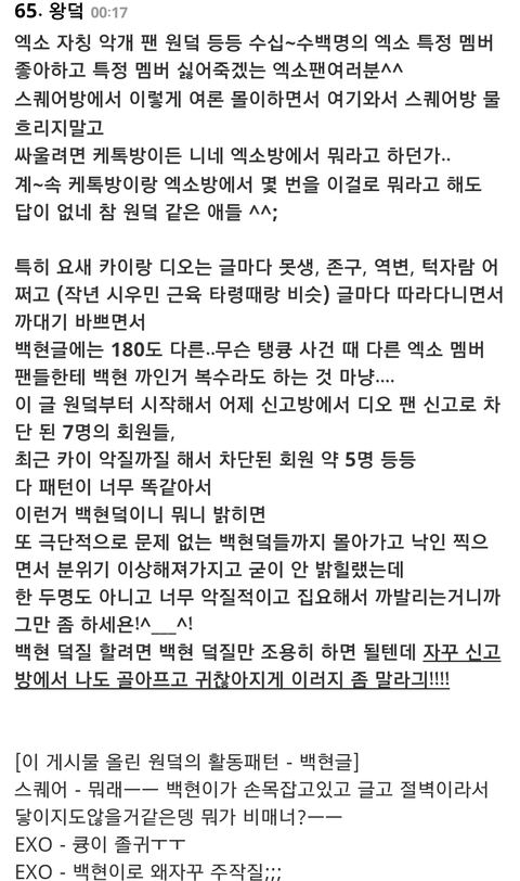 백현악개 더쿠에서 20명이 멤버까다 걸려서 공지올라감 창피한줄알아라 판이랑 이용자 겹치는거빼박이니 올린다