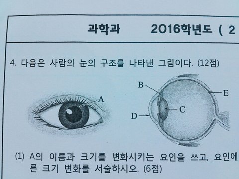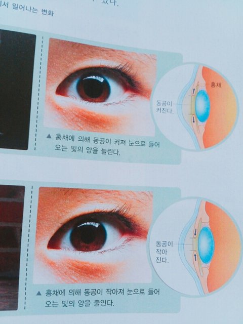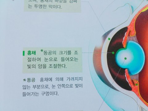 근데 교과서나 문제집에 보면 분명 '홍채에 의해 동공의 크기가 변한다' 라고 써있으니까, 크기가 변하는 것은 동공이라고 생각하고 대부분의 학생들이 동공이라고 썼음. 아래 사진은 교과서에 나와있는 말들이야