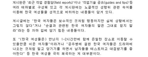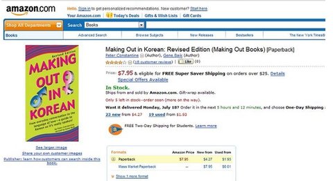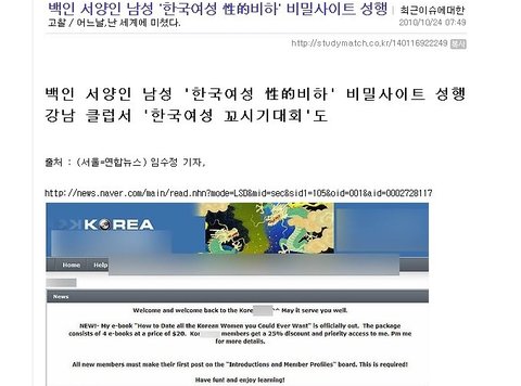 제의 책은 ‘한국 여성 꼬시기(making out in korean)’다. 사이트의 책 소개글은 그야말로 가관이다. “이 책은 가장 쉽게 한국여자와 데이트를 할 수 있는 대화법을 소개한다. 책에 소개된 재치 있으면서 분위기를 주도하는 말로 한국 여성을 꼬셔라. 이 책이 당신을 데이트 선수로 만들어 줄 것이다”라고 적혀있다.