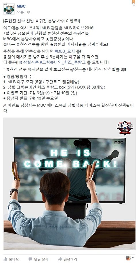 우리 팀도 그 날은 평소보다 30분 일찍 나가서 점심 먹기로 했어요. 이번 류현진 복귀가 인기가 많기는 한지 MBC 공식 페이스북도 본방 사수 이벤트를 하더라고요.