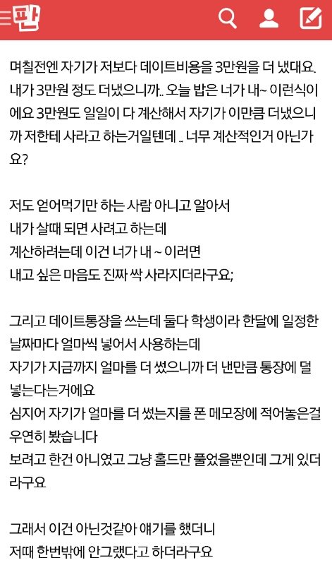 비즈니즈 관계도 이렇게 안할것같은데 여자친구한테 썼던 돈을 일일이 다 적어놓고 나중에 똑같이 받을거라는 생각을 한다는게 너무 충격이 커서 ..