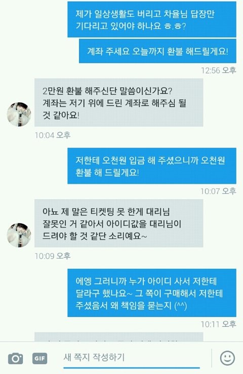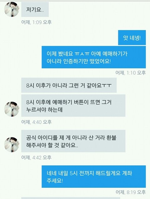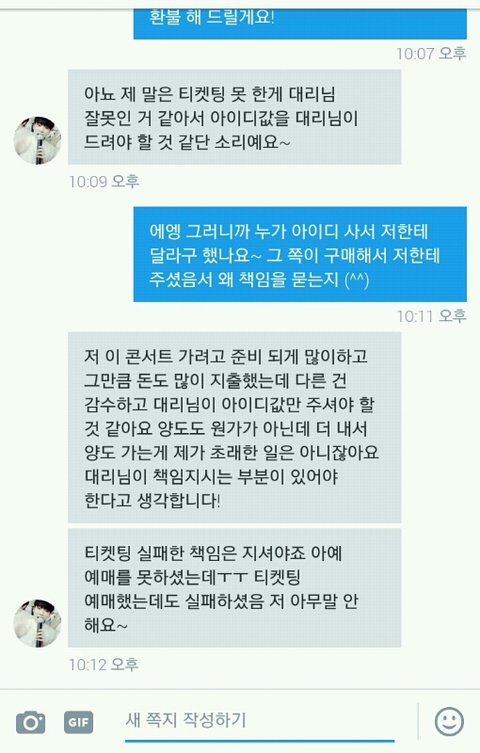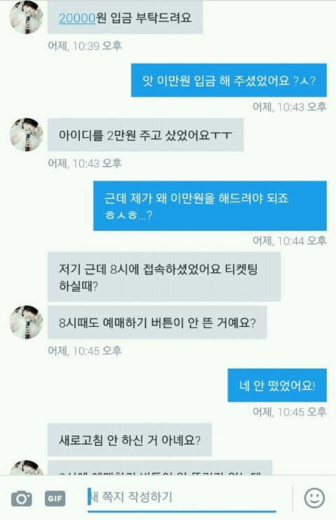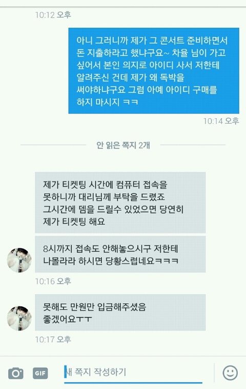 내가 대리티켓팅을 해주는데 선입금 5000원을 받거든? 실패해도 환불 안 해준다고 미리 말 하고! 이번주 화요일에 ㅇㅍㄴㅌ 선예매 대리티켓팅을 하기로 했는데 예매하기가 안 뜨고 5기 인증하기가 뜨는 거야 그래서 내가 8시 전에 그 사람한테 캡처해서 보내고 인증하기 어떻게 해야 되냐고 했는데 답장이 8시 이후에 왔어 나는 어떻게 해야 될지도 모르겠고 인증 안 하면 선예매 티켓팅 못하니까 ㅇㅅ 추가콘 대리 티켓팅 뛰었는데 갑자기 이 사람이 자기가 공식 아이디를 2만원 주고 샀는데 내가 실패했으니까 2만원을 주래 ㅋㅅㅋ 내가 사라고 한 것도 아니고 지가 가고 싶어서 아이디 구매한 담에 나한테 준 거면서 내가 왜 그 돈을 내야 되는지 모르겠는데 ㅋㄷㅋㄷ 내가 이상한 거야?