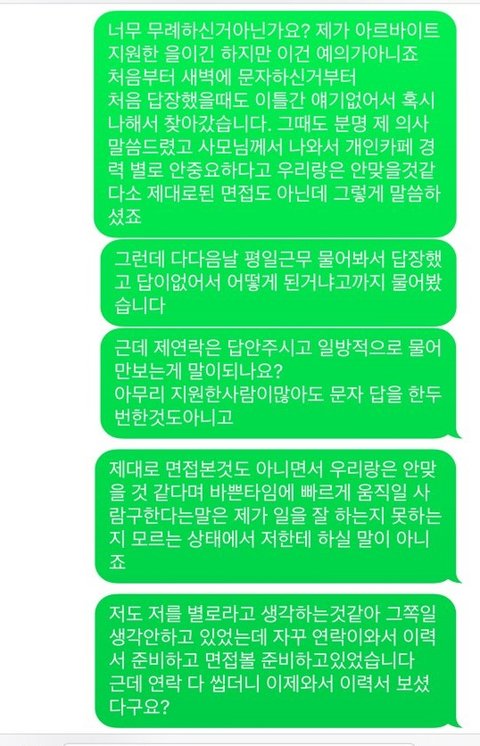 ...솔직히 매니저와 면접볼때까지는 나중에 이력서 가져와서 다시한번 말해야지 하고 기분나쁘거나 한것도 없었습니다. 그런데 사모 나와서 얘기하면서 부터 불쾌하더라구요. 나중에 굳이 오겠다고 했는데도 본인들이 당장궁금하니 물어보면서 저한테 시간 뺏는다고 하는거, 우리랑은 안맞는데 어쩌지? 이러면서도 계속물어보고 사람 앞에서 서서 팔짱끼고 고개 좌우로 흔들면서...... 그래도 사장님이니까, 이것도 면접이니까, 궁금한거 물어봐야지 하고 생각했습니다.